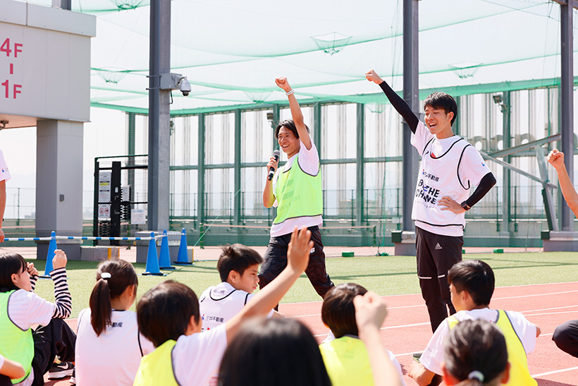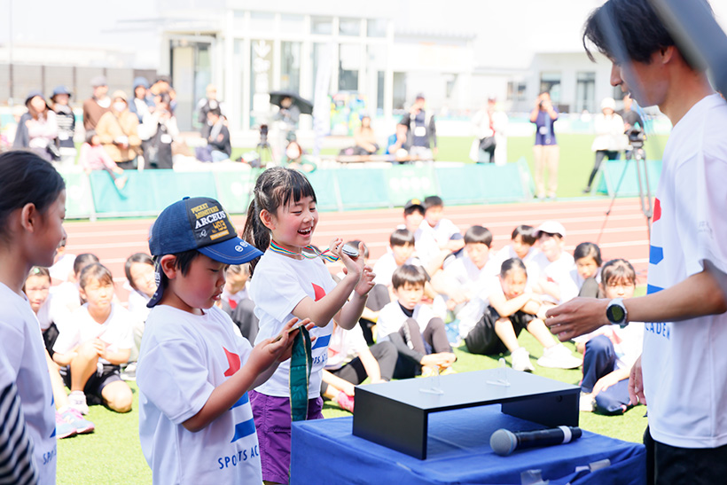 ウォーミングアップから始まり、早く走るためのトレーニングやチーム対抗リレー、「赤﨑選手と勝負!トラック5周チャレンジ」など盛りだくさんの内容で、参加者の子どもたちも走ることの楽しさを徐々に実感している様子でした。