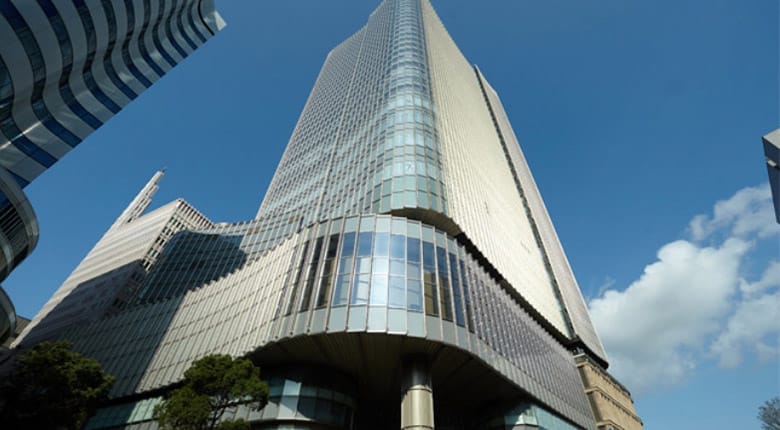 「建物の頂部とカーブを描く壁面は、他に見られない際立ったデザイン。柔らかな印象のファサードはいかなるビルとも一線を画し、どこから見ても目立つランドマークとして唯一無二の存在感を発揮します。かつて日比谷にあった鹿鳴館から受けたインスピレーションは、設計当初からのアイデアです。舞踏会でカップルがダンスをするイメージがデザインの原点。まさに”ダンシングタワー”というコンセプトとして、ビルの柔らかなファサードを決定しました。また低層部では石造りのエッセンスを取り入れ、優美さを表現しました」。