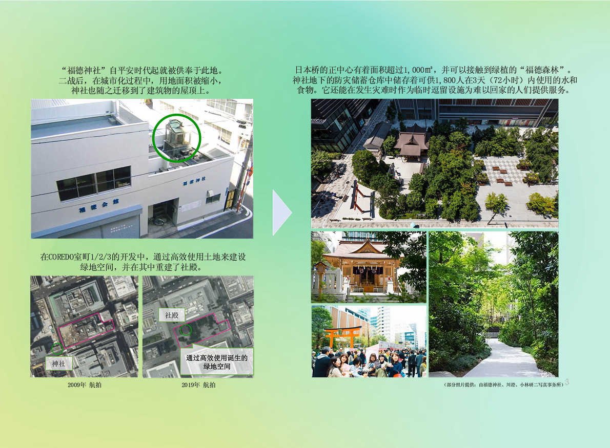 重建福德神社的社殿,建设了将面积超过1,000㎡的用地中央作为广场的福德之森。还能在发生灾难时作为临时逗留设施为难以回家的人们提供服务(照片提供:福德神社)