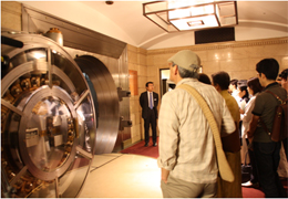 関東大震災後、アメリカ最新鋭の設計・施工技術を駆使して建てられた大建築。コリント式列柱の並ぶ外観のみならず、内部の営業室では精緻に彩色されたクラシカルな装飾を堪能できます。大金庫が閉まる瞬間も見学可能。