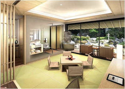 - 日本庭園を臨む露天風呂やデッキテラスなど広々としたお部屋でワンランク上のご滞在を実現する露天風呂付き特別客室「プレミアムスイート(仮称)」