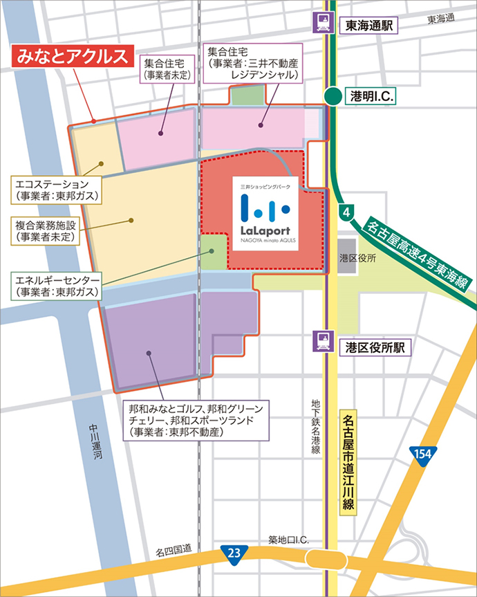 当施設は、東邦ガスグループが主導する大規模複合再開発事業によって新しく誕生するまち「みなとアクルス」内に立地し、まちの賑わいを創出する中核機能を担います。また、三井不動産レジデンシャル株式会社(本社:東京都中央区 代表取締役社長 藤林清隆)が、当施設の北側に隣接する「みなとアクルス」内の敷地において、分譲マンション開発を行う予定です。