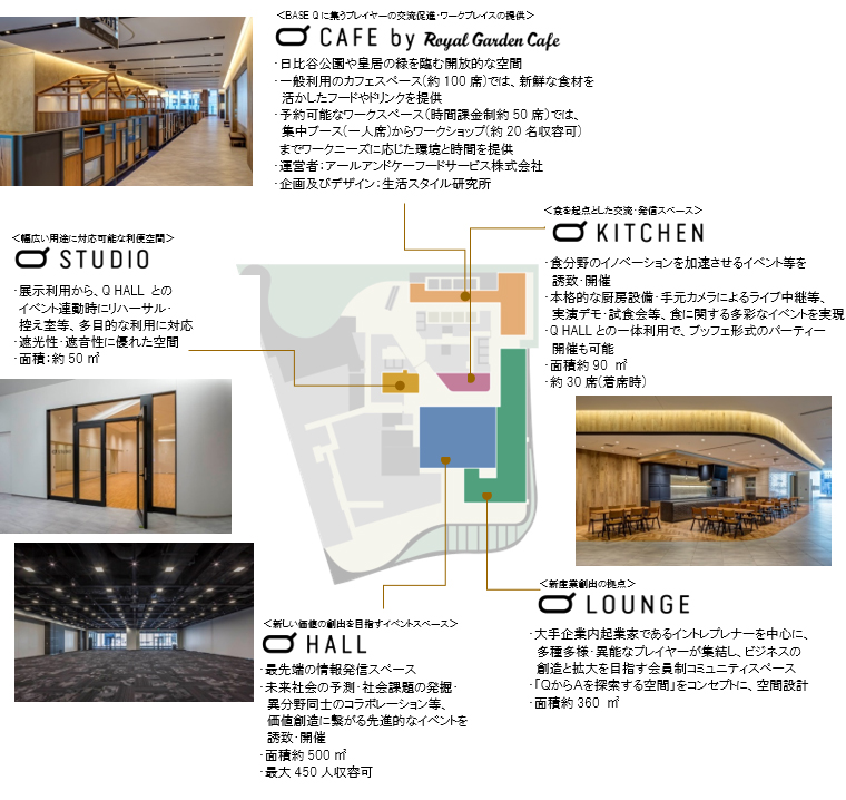 「BASE Q」は、新たな価値の創出と社会課題の解決を目指す人々が集うビジネス創造拠点として、後述のオープンイノベーション支援プログラムの運営拠点となるコミュニティスペース「Q LOUNGE」のほか、450人規模のイベントスペース「Q HALL」、「Q KITCHEN」や「Q STUDIO」など、さまざまな設備を備え、最先端のテクノロジーやイノベーションのアイディアが集う各種イベントを開催します。