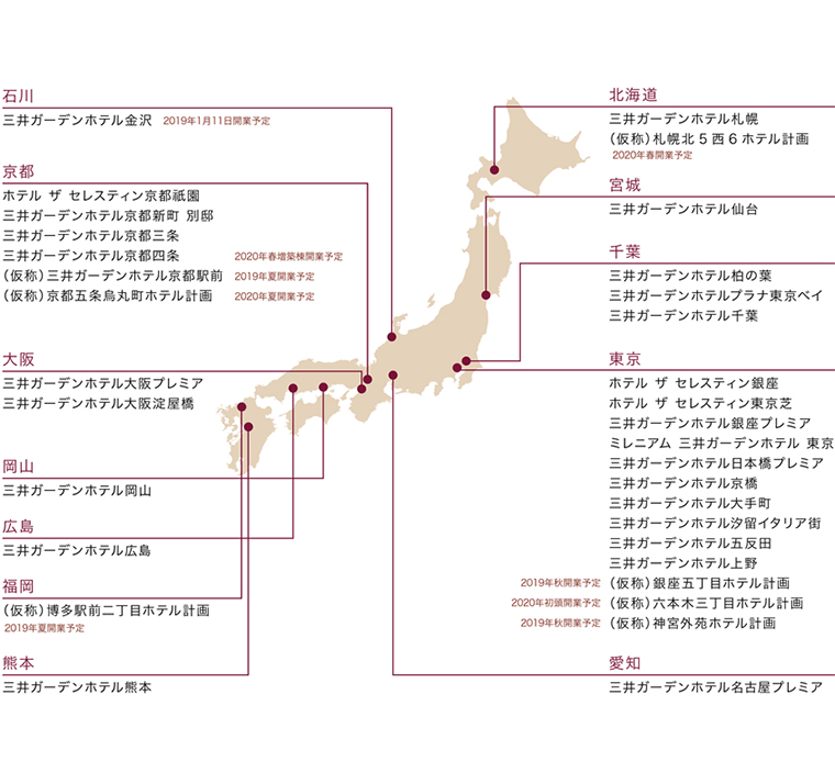 株式会社三井不動産ホテルマネジメントは、現在、アッパーミドルクラスの宿泊主体型ホテルである「三井ガーデンホテルズ」と、ハイクラスの宿泊主体型ホテルである「ザ セレスティンホテルズ」を全国で計25施設6,545室運営しております。