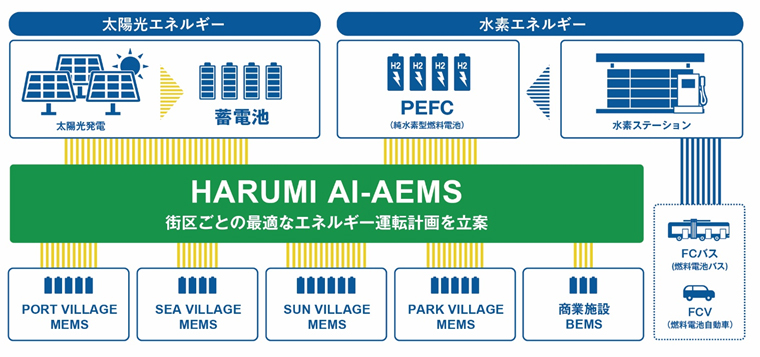 日立は、こうした経験・ノウハウと、AIをはじめとした先進のデジタル技術を活用したHARUMI FLAG向けのAEMSの開発・導入を通じて、住民や利用者の皆さまへの安全・快適な空間の提供と、水素も含めた高効率なエネルギー活用によるHARUMI FLAGの社会価値・環境価値の向上に貢献します。