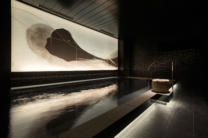 ゲスト専用の大浴場は、入浴時にも寺の所作を体感いただけるよう、手水鉢のオブジェと、その背景に水墨画を連想させる光壁アートを配置しました。その他の内装をブラックアウトさせることで、手水鉢とアートだけが幻想的に浮かび上がり、空間に無限の奥行きを演出します。光壁アートは、男性大浴場が「無常」、女性大浴場が「輪廻」をコンセプトとして描かれています。「無常」には力強さ、「輪廻」には優しさが、それぞれ想いとして込められています。