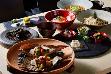 2階レストランには、福岡県内で飲食事業等を複数展開する「ONO GROUP」が、ミシュランガイドへの掲載実績のある「僧伽小野 一秀庵」(所在:福岡県糸島市)の2号店となる「僧伽小野 京都浄教寺」をオープンします。朝食はプレート形式でのご提供とし、メイン料理を「僧伽ちらし寿司」「鰻の卵とじ」「鰻のかぶら蒸し」「天ぷらと鯛茶づけ」の4種類からお選びいただけます。オリジナルの「僧伽ちらし寿司」は、浄土の世界観を表現した野菜ちらし寿司であり、色鮮やかな見た目と野菜の旨み・深みをご堪能いただける一品となっております。昼食では、ミシュラン掲載店「赤間茶屋 あ三五(あさご)」直伝の手打ち蕎麦もご提供いたします。夕食では、「吉兆」で長年腕を振るった料理長こだわりのすっぽん料理をはじめ、鰻やハモなど旬の食材を用いたコース料理等をお召し上がりいただけます。