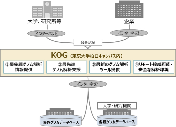 今般、国内のゲノム関連研究の発展のため、KOGは国立大学法人東京大学大学院新領域創成科学研究科附属生命データサイエンスセンター(以下、「東京大学」)および国内外のゲノムデータ集約機関と連携し、最先端のゲノム解析インフラや、リモート接続可能な解析環境等を提供する包括的サービスを開始しました。
