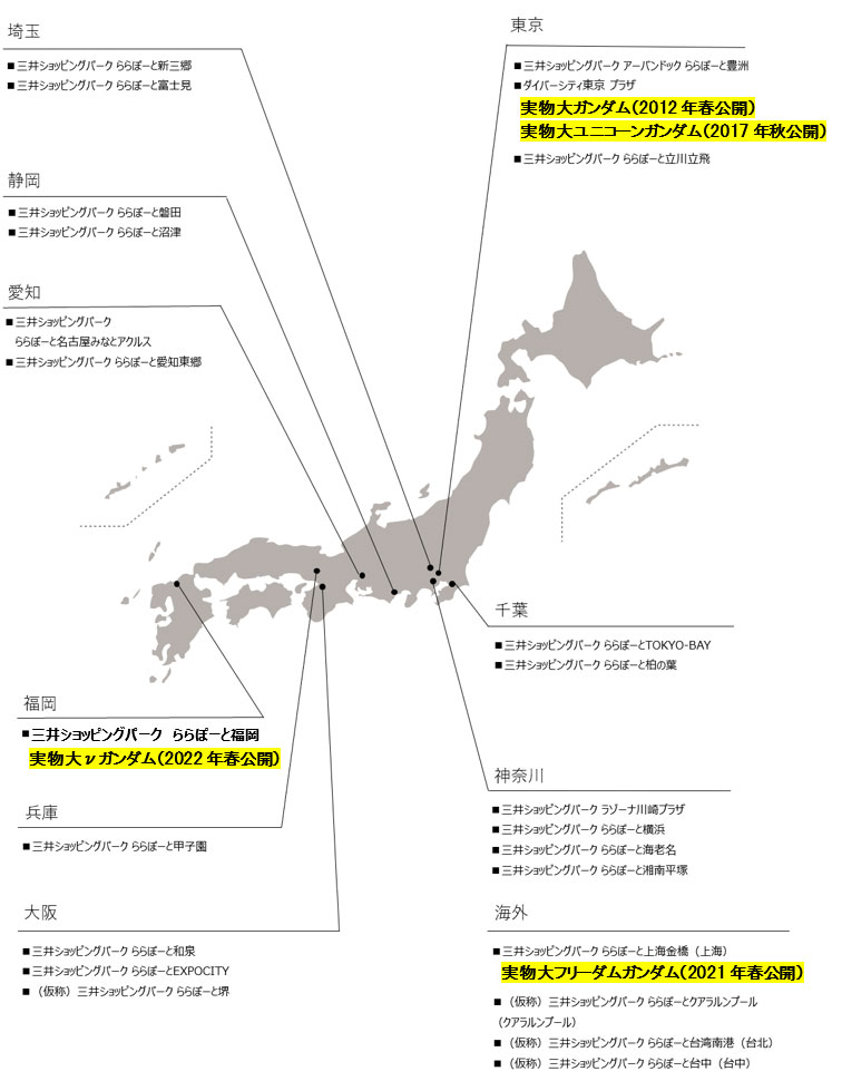 なお、三井不動産が展開する商業施設における実物大ガンダム立像は、バンダイナムコグループと連携して建設されています。「ダイバーシティ東京 プラザ」では2012年春から「実物大ガンダム」(現在は「実物大ユニコーンガンダム」)、「三井ショッピングパーク ららぽーと上海金橋(中国)」では本年春から「実物大フリーダムガンダム」が公開中で、2022年春に立つ「実物大νガンダム」は九州初の実物大ガンダム立像となります。