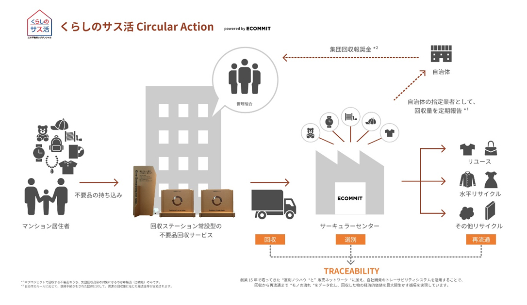 三井不動産レジデンシャル株式会社(本社:東京都中央区、代表取締役社長:嘉村 徹)と株式会社ECOMMIT(本社:鹿児島県薩摩川内市、代表取締役:川野 輝之)は、ご入居者様が不要になった衣類等を次の利用者へ届けるための回収ステーション常設型の不要品回収サービス「くらしのサス活Circular Action(以下、本サービス)」を2023年5月16日より開始しましたのでお知らせいたします。