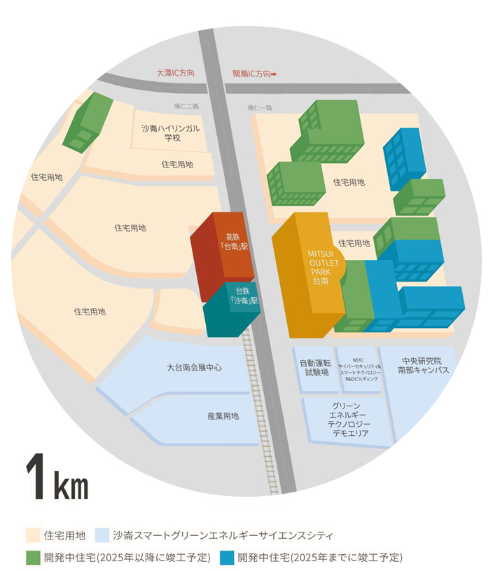 本施設は、沙崙(シャロン)スマートグリーンエネルギーサイエンスシティ計画の中心部に位置しています。今後コンベンションセンターや研究所の開発も予定されており、観光客のみならず、コンベンションセンターへの来訪者やワーカー、研究者、学生など多様な人々が交流するエリアとして注目されています。本エリアでは、多数の住宅開発計画も進行しており、周辺1km圏内では、2027年までにおよそ6,000世帯の増加が見込まれています。