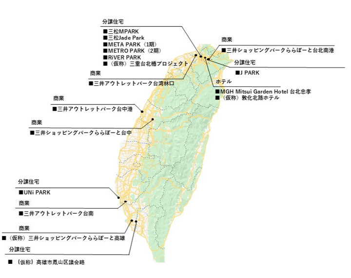 台湾では、2016年に設立した現地法人(台湾三井不動産股份有限公司)を投資拠点として、台湾各地で商業施設事業、ホテル事業、および住宅事業の計16事業を推進しています。また物流施設、複合施設事業などの展開を目指し、今後も更なる事業の拡大をはかります。