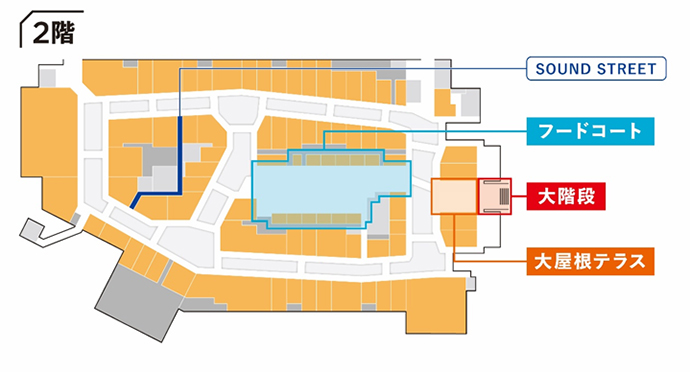 - 2F中央にはフードコート・レストラン・軽飲食・食物販店舗合計24店舗が集まるフードゾーンを形成。