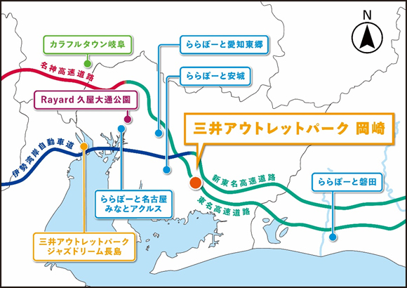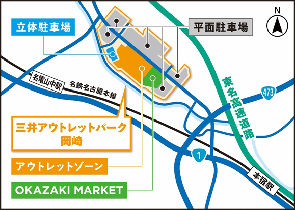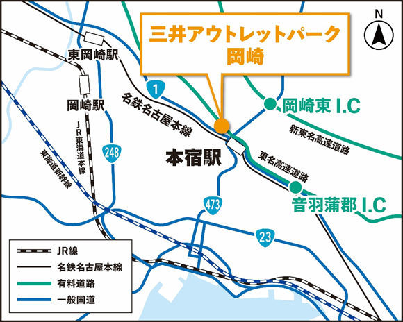 愛知県初の本格的※2アウトレットモールである本施設は、名古屋鉄道本線「本宿」駅から徒歩圏内で国道1号線や新東名高速道路「岡崎東」IC、東名高速道路「音羽蒲郡」ICからも至近の交通利便性が高い立地に位置しています。