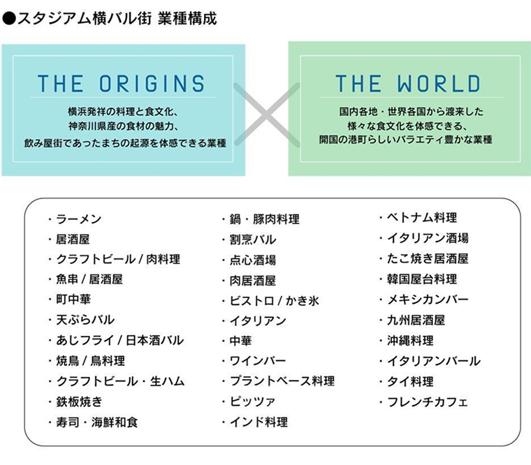 - 商業エリアには、新業態2店舗を含む全55店舗がオープン。また、34店舗からなる国内最大級の小割飲食ゾーンの名称を「スタジアム横バル街」に決定