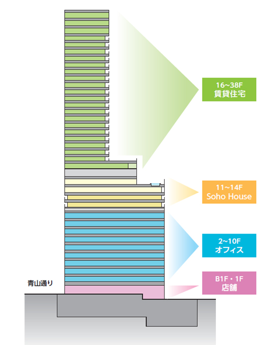 地上38階建の施設内では、六本木方面をはじめ眺望の開ける16~38階に賃貸住宅を配置してビューを確保するとともに、11~14階にSoho Houseを、2~10階にフロアプレート約1,200m2のオフィスを配置します。1階には4つの飲食・物販店舗がオープンします。