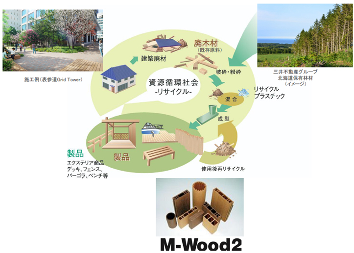 外構に利用されるデッキやベンチには、三井不動産グループが保有する森林木材を原料の一部として利用した「M-Wood2」(※)を採用しており、グループ内での新たな資源循環のかたちを実現しています。