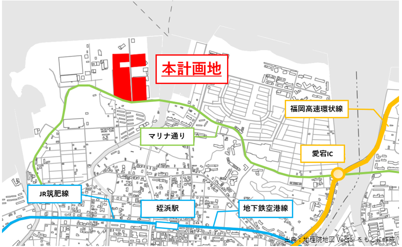 本計画は「マリノアシティ福岡」のアウトレット棟を建替えるとともに、一部既存建物をリニューアル・再活用します。本計画地は、幹線道路である「マリナ通り」に接し、福岡高速環状線「愛宕」ICから約2kmと至近で、広域アクセスに優れています。また、最寄りの福岡市地下鉄空港線「姪浜」駅は、「福岡空港」駅から約25分と、福岡空港・博多駅・天神からの交通利便性も高い立地です。