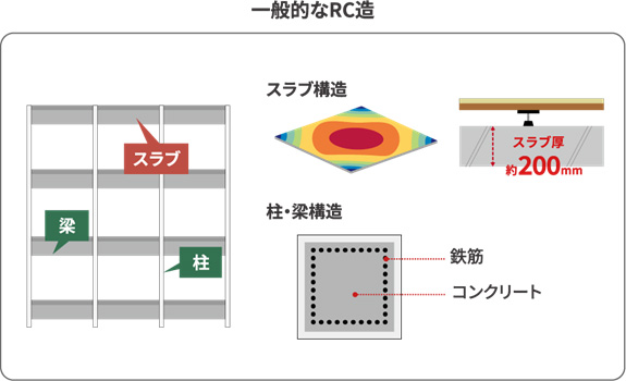 一 般的な集合住宅の床を支える スラブは、約200mm程度のスラブ厚が必要とされています。一方、曲面シェルスラブ木質ハイブリッド工法では、VUILDのデジタルファブリケーション技術を活用し、床スラブを曲面形状とすることで、荷重を効率よく分散させます。これにより、スラブ厚を最薄約80mm程度まで抑えることができるため、建築時に使用するコンクリート量の削減を可能にします。さらに、スラブ形成時の型枠を内装仕上げ材としても活用することで、内装の木質化によるCO2削減にも寄与します。