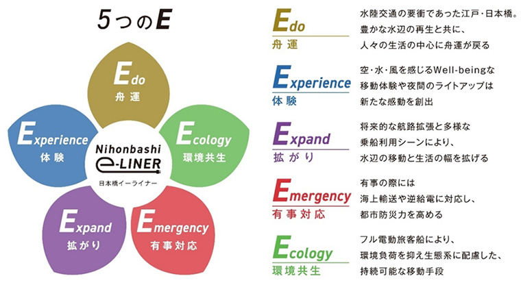 静音、低振動、燃料臭気ゼロに加え、「Nihonbashi e-LINER」の‘e’は5つのeで始まる言葉を表しています。