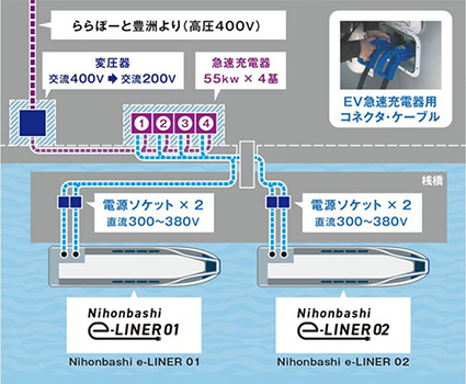 本船への電力(再生エネルギー)は、ららぽーと豊洲内にある高圧受電設備から送電・再変圧し、4基の急速 充電器に供給しています。