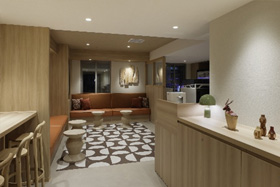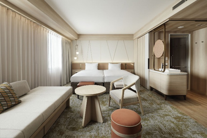 3~4名でご宿泊いただける客室を20 室から140 室へ大幅に増設。さらに、全ての客室で水回りの設備を一新。 - ロビーや客室には、三井不動産グループ保有林の間伐材や、リサイクルカーペットを採用し、環境と共生するホテルステイを目指すとともに、エントランスロビーや大浴場は地域の魅力や風土を感じる意匠へ刷新。長期滞在ニーズに応える「ユーティリティラウンジ」も新設。