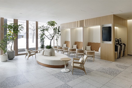 エントランスには美瑛町所在の「青い池」、ロビーには赤レンガ庁舎の庭や池をモチーフにした迫力のあるアートを配置するなど、北海道や札幌のローカリティを感じられる空間へと全面刷新いたしました。また、ロビーラウンジの内装・家具を一新し、植栽と調和した空間を創出しています。ゲストとホテルの最初の接点であるレセプションカウンターの天板には三井不動産グループ保有林の間伐材を利用し、木のぬくもりとともにゲストを温かくお迎えします。