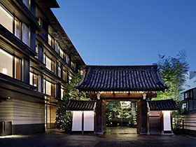 ユネスコ世界遺産の二条城の真向かいに250年以上にわたって存在した三井総領家の邸宅跡地に建ち、300年以上の歴史ある門や敷地から湧く温泉を備え、視覚だけではなく五感すべてを楽しめる空間として評価されました。