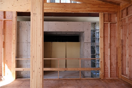 木構造に接続された火熱遮断壁(施工時写真)
