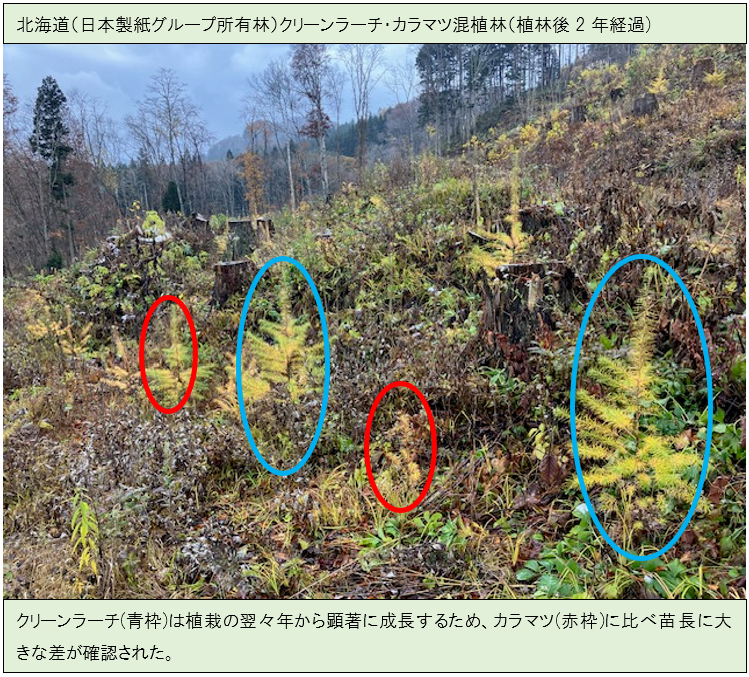クリーンラーチは、グイマツ精英樹を母親、カラマツを父親として、地方独立行政法人 北海道立総合研究機構によって新しく開発された種間雑種です。CO2を固定する能力が普通のカラマツより7~20%高いことに加えて、成長速度が比較的早く、育成過程で発生する下草刈りの回数が減るなどの特徴を持っています。