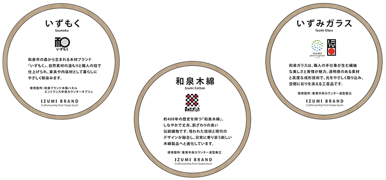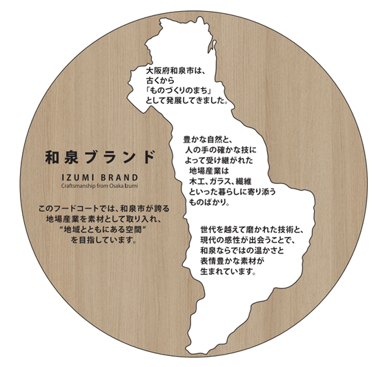また、フードコートでは地域に根差した商業施設の取り組みとして、和泉市の文化的資産や産業を取り入れています。エントランスゾーンのラウンドテーブルでは、“いずもく” で和泉市の輪郭をかたどった積層パネルとサインを設置し、中央エリアのカウンター席の衝立には、色鮮やかな“和泉木綿”と“いずみガラス”を使用しています。