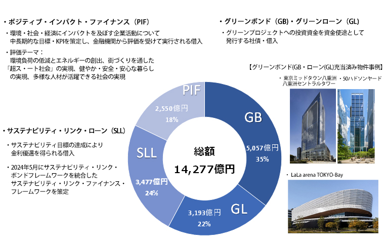 2023年度は総額2,300億円、2024年度は総額300億円のグリーンボンド発行をはじめ、グリーンローン、サステナビリティ・リンク・ローンおよびポジティブ・インパクト・ファイナンスなど、多様なサステナブルファイナンスの手法を用いて調達を実施してきました。2025年12月末時点において、三井不動産のサステナブルファイナンス調達額は累計額14,277億円となっております。