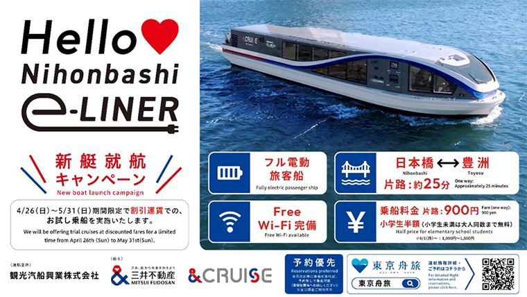 - 新艇就航を記念して、同日~2026年5月31日(日)の期間限定で、『Hello♥Nihonbashi e-LINERキャンペーン』を開催(運航事業:観光汽船興業、三井不動産:船主)。