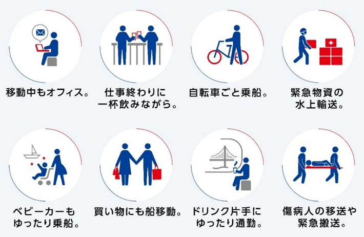 | (7)その他 | デジタル対応:フリーWi-Fi、充電コンセント、バリアフリー対応、自転車積載可(船外2台) 低頭型船舶※24時間365日100%航行可能(但し、異常潮位除く) |