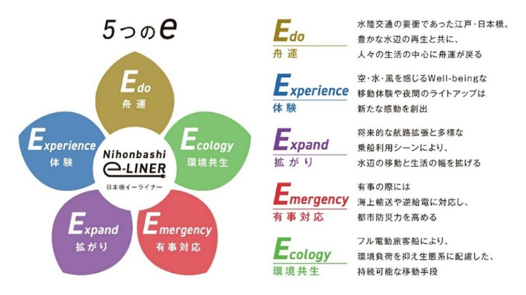 静音、低振動、燃料臭気ゼロに加え、「Nihonbashi e-LINER」の‘e’は5つのeで始まる言葉を表しています。