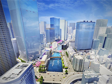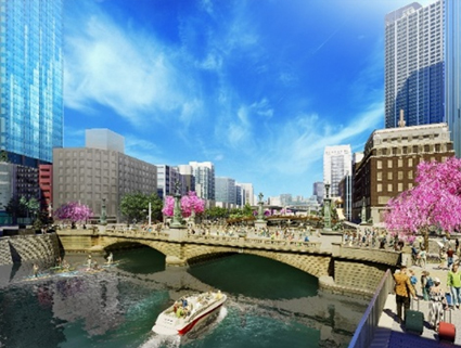 江戸橋上空から首都高速道路の高架橋が撤去された『日本橋リバーウォーク』を望む※