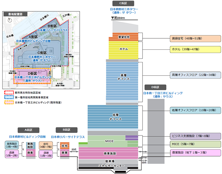 - 高さ284mのメインタワーの建物名称は「日本橋野村三井タワー(通称:ザ タワー)」に決定。