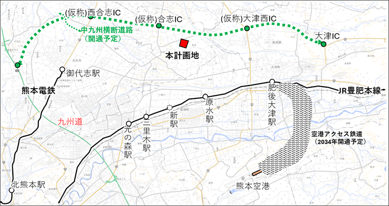 周辺県道の新設・拡幅とともに整備中の中九州横断道路(仮称)合志ICより約2kmに位置し、また、阿蘇くまもと空港(本プロジェクト予定地より約12km、当社が筆頭株主である熊本国際空港株式会社が運営)と豊肥本線を結ぶ空港アクセス鉄道(2034年開通予定)も計画されるなど、広域交通アクセスに恵まれています。