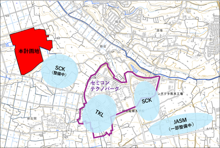 本プロジェクト予定地は、Japan Advanced Semiconductor Manufacturing株式会社(以下、「JASM」)、東京エレクトロン九州株式会社(以下、「TKL」)、ソニーセミコンダクタマニュファクチャリング株式会社(以下、「SCK」)をはじめとする半導体関連企業が立地する、国内有数の産業集積エリアに近接しています。