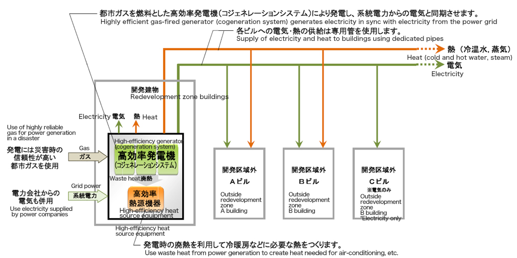 - Moreover, the business will preferentially supply mainly existing buildings outside the redevelopment zone heat from state-of-the-art high-efficiency heat source equipment that is generated in an environmentally friendly way. It will also promote the use of all the waste heat from power generation and maximizing energy use in existing zones. In these ways, the business will help make the city more environmentally friendly in terms of energy savings and CO2 reductions within the redevelopment zone and neighboring areas.