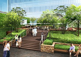 A bridge will connect to the podium rooftop of the Nihonbashi Takashimaya Mitsui Building, the Nihombashi Takashimaya S.C. Main Building and the Taiyo Life Nihonbashi Building, which will feature one of Tokyo’s largest unified rooftop gardens (approx. 64,583 ft2 (6,000 m2)), enhancing accessibility and contributing to even greater urban energy. The road located between the Nihonbashi Takashimaya Mitsui Building and the Nihombashi Takashimaya S.C. Main Building will be turned into a pedestrian-only road, which will be covered by a roof to create the Nihonbashi Galleria, a street lined with stores that will enhance the liveliness and neighborhood feel of the area, becoming a new bustling center of activity in Nihonbashi.