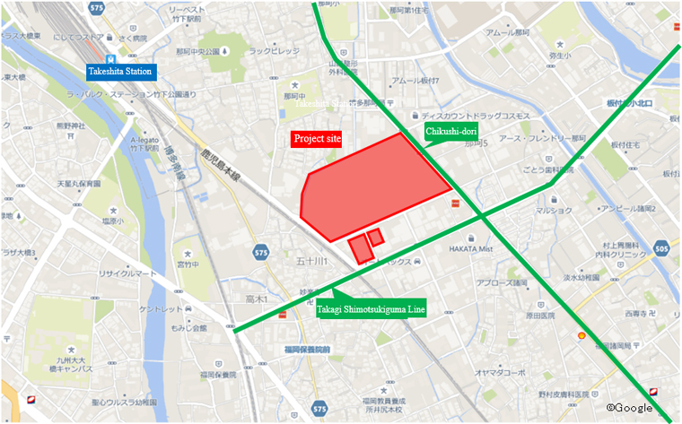 The planned has an excellent road transportation network, being adjacent to the main road, Chikushi-dori, and close to the Fukuoka Outer Loop Road. It is close to Fukuoka Airport and Hakata Station, which are wide-area transportation hubs, making it a prime location for access from a wide area. The site is also convenient for public transport, with Takeshita Station on the JR Kagoshima Main Line within walking distance and plans for a bus terminal to be newly established at the site. The five-story facility will have total floor space of approx. 2,221,700 ft2 (approx. 206,400 m2), with plans for parking spaces for approx. 3,050 vehicles.