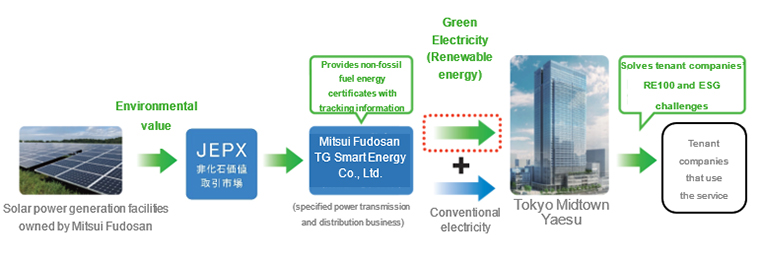 We are exploring how to utilize green energy in the tenanted areas (such as offices owned and sublet by Mitsui Fudosan) and communal areas. Starting in Tokyo Midtown Hibiya and other facilities in April 2021, we are planning to roll out this service in stages in office buildings in the Tokyo metropolitan area. In this way, we help companies solve their RE100 and ESG challenges so that we can achieve SDGs and help become a carbon-free society.