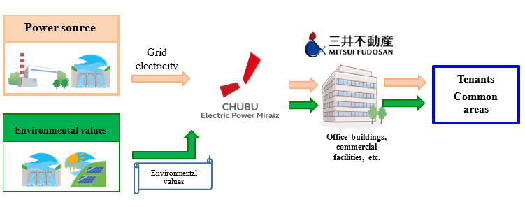 - In the Chubu region where Chubu Electric Power Miraiz supplies electrical power, Mitsui Fudosan will begin offering the Green Energy Supply Service*1, which adds environmental value to electricity usage such as post-FIT residential solar power generation for tenants of the main facilities that Mitsui Fudosan owns and subleases, starting sequentially in April 2022. This system will be the first of its kind in the Chubu region.