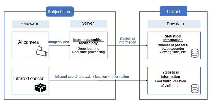 Example: Acquire customer location information using infrared sensors, and compare factors such as the duration of visit and number of customers entering the store for each VMD pattern - Analyze the measurement results and make improvements based on the outcome