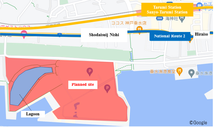It is conveniently located within walking distance from Tarumi Station and Sanyo-Tarumi Station where the JR Kobe Line and the Sanyo Electric Railway intersect, and very close to Takamaru Interchange and Myodani Interchange on Daini Shinmei Road as well as National Route 2. Since the outlet mall opened in October 1999 as Marine Pia Kobe Port Bazaar initially, it has been cherished by many visitors. It is closing temporarily for integrated reconstruction, including the premises surrounding a lagoon (pond with water drawn from the sea) as a newly expanded business area.