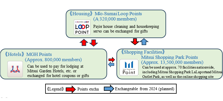 Since August 2023, Mitsui-No-Sumai Loop, a housing-related membership club of the Mitsui Fudosan Group, Mitsui Shopping Park Members Program, a membership club for shopping facilities, and the MGH Rewards Club, a membership club for hotels, have been linked, and points can be exchanged to use the services of other membership clubs. This will promote cross-usage of products and services within the Mitsui Fudosan Group.