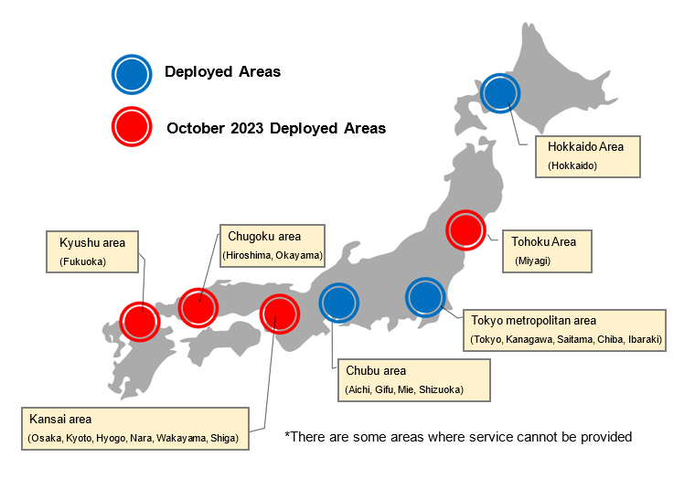In addition, although the service was previously provided only in the Tokyo metropolitan area, it will be expanded to six major locations (Hokkaido, Tohoku, Chubu, Kansai, Chugoku, and Kyushu).