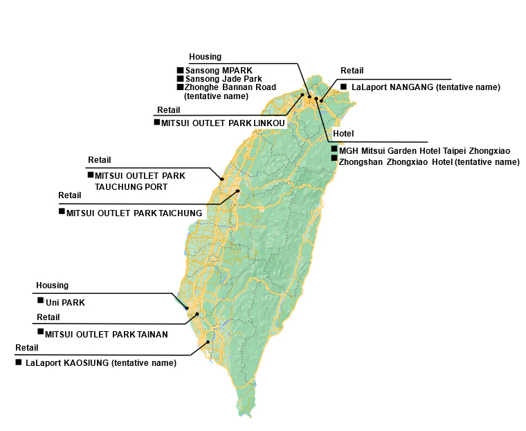 In 2016, the Mitsui Fudosan Group established Mitsui Fudosan Taiwan Co., Ltd., a subsidiary in Taiwan, as an investment base. The Group is undertaking 12 projects in Taiwan, including retail properties, hotels, and housing, and plans to continue expanding the business into logistics facilities and mixed-use developments going forward.