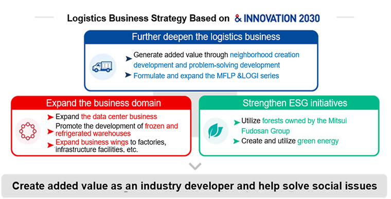 In response to this situation, the Company will continue to expand its business by connecting various people, services, and goods, not only through the leasing and sale of facilities, but also through the expansion of MFLP &LOGI services and the development of mixed-use business facilities equipped with data centers and multi-use functions. This will contribute to solutions to the whole range of issues facing customers. As an industry developer, the Company will accelerate innovation in cities and society overall and contribute to the creation of richer, more sustainable regions and cities.